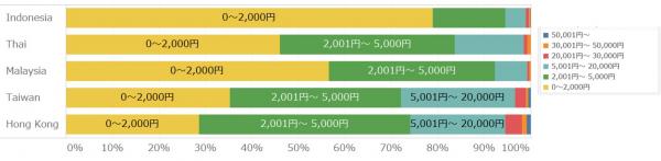アジア5カ国で聞いたデータでは、2,001~5,000円が全体の32.4%と多いものの、国別で見ると、大きな差が見えてきました。台湾や香港は比較的高めの化粧品を手に取る傾向にあり、5,001~20,000円の割合が多いことがわかりました。