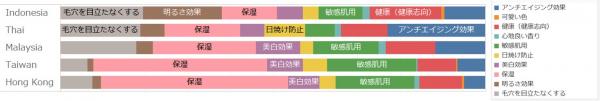 化粧品に求めることは、各国の気候や風土、年齢や性別によっても違いが出てくるはずです。5カ国の合計で最も多いのは「保湿」という答えでした。つまり肌の乾燥を気にしているということ。
