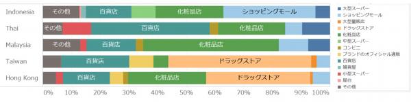 そのほかの購入場所をみると、百貨店やショッピングモール、化粧品店、スーパー、コンビニなど、日本と変わらないことがわかります。