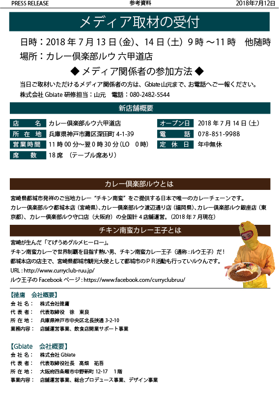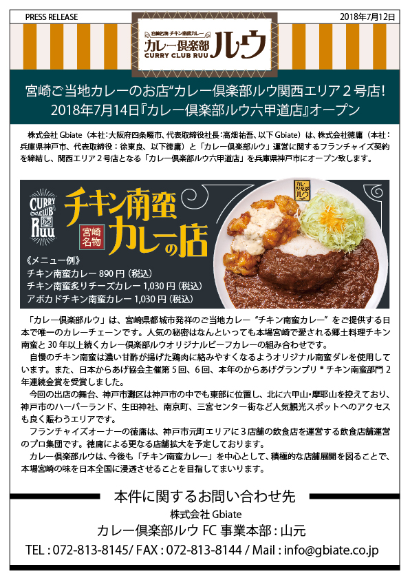 「カレー倶楽部ルウ」は、宮崎県都城市発祥のご当地カレー“チキン南蛮カレー” をご提供する日本で唯一のカレーチェーンです。人気の秘密はなんといっても本場宮崎で愛される郷土料理チキン 南蛮と30年以上続くカレー倶楽部ルウオリジナルビーフカレーの組み合わせです。 自慢のチキン南蛮は濃い甘酢が揚げた鶏肉に絡みやすくなるようオリジナル南蛮ダレを使用して います。また、日本からあげ協会主催第5回、6回、7回、本年のからあげグランプリチキン南蛮部門金賞を受賞しました。 今回の出店の舞台、神戸市灘区は神戸市の中でも東部に位置し、北に六甲山・摩耶山を控えており、 神戸市のハーバーランド、生田神社、南京町、三宮センター街など人気観光スポットへのアクセス も良く賑わうエリアです。 フランチャイズオーナーの徳庸は、神戸市元町エリアに3店舗の飲食店を運営する飲食店舗運営 のプロ集団です。徳庸による更なる店舗拡大を予定しております。 カレー倶楽部ルウは、今後も「チキン南蛮カレー」を中心として、積極的な店舗展開を図ることで、 本場宮崎の味を日本全国に浸透させることを目指してまいります。