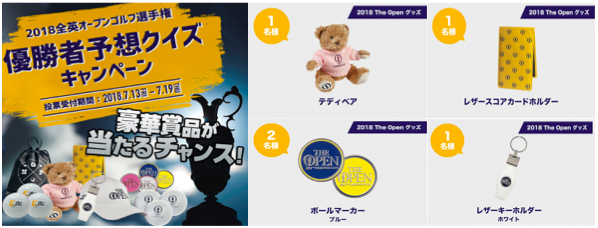 さらに、松山英樹プロを筆頭に多くの日本人選手出場が見込まれる第147回大会の優勝者を予想する『2018全英オープンゴルフ選手権優勝者予想クイズキャンペーン』の投票の受付を7月13日(金)から7月19日(木)23:59まで実施します。