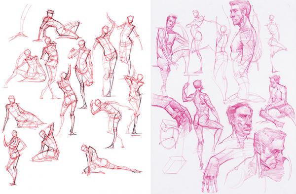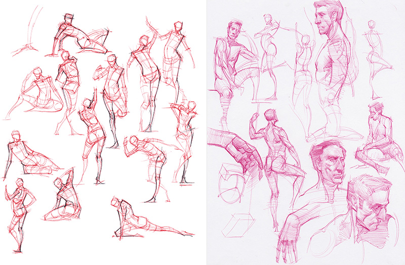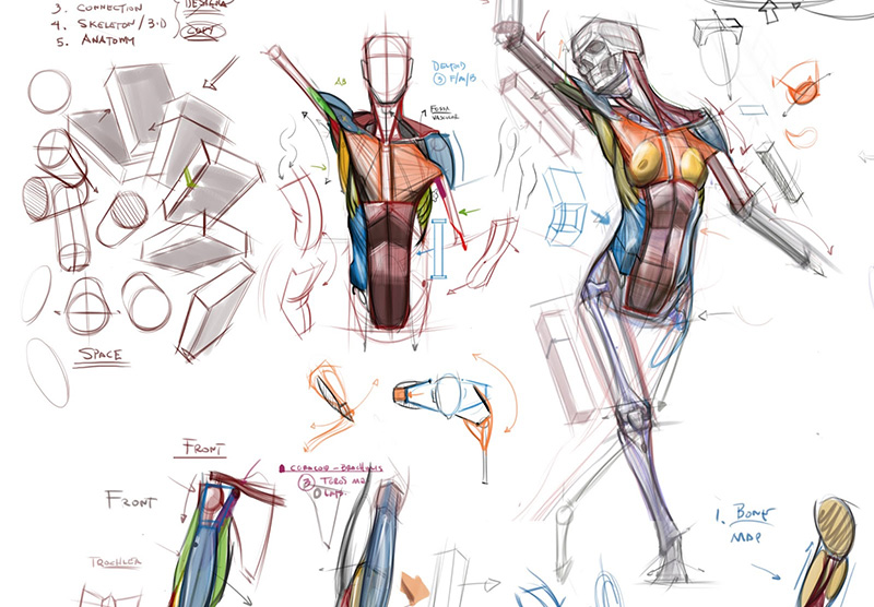 ジェスチャーからはじまり、主要な骨格、接続部の順に説明し、人体のリズム、プロポーション、シェイプ、パースといった概念についても触れます。
