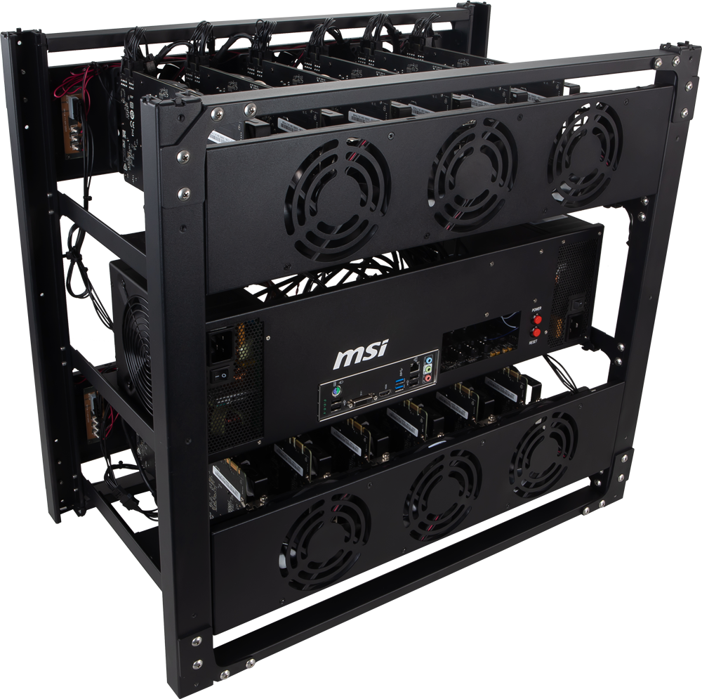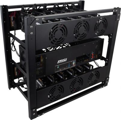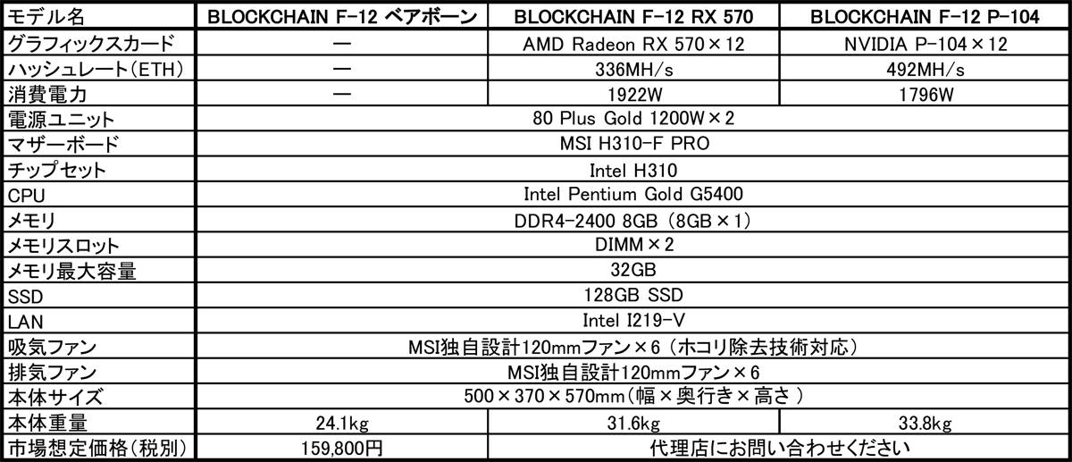 オープンフレームの筐体には、Intel H310チップセットを採用したマイニングマザーボード「H310-F PRO」と、CPUとしてIntel Pentium Gold G5400、メモリ8GB、128GB SSDを搭載。80 Plus GOLD認証の1200W電源ユニットを2台、MSI独自設計の120mmファンを吸気用に6基、排気用に6基搭載することで、グラフィックスカードの安定動作と効率的な冷却を可能にしています。ベアボーンの市場想定価格(税別)は、159,800円です。MSIでは、このベアボーンに加え、AMD Radeon RX 570グラフィックスカードを12枚、またはNVIDIA P-104グラフィックスカードを12枚搭載したシステムもご用意しています。