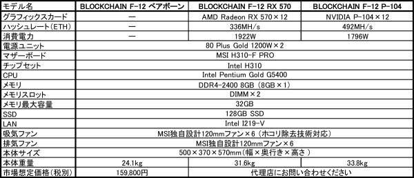 オープンフレームの筐体には、Intel H310チップセットを採用したマイニングマザーボード「H310-F PRO」と、CPUとしてIntel Pentium Gold G5400、メモリ8GB、128GB SSDを搭載。80 Plus GOLD認証の1200W電源ユニットを2台、MSI独自設計の120mmファンを吸気用に6基、排気用に6基搭載することで、グラフィックスカードの安定動作と効率的な冷却を可能にしています。ベアボーンの市場想定価格(税別)は、159,800円です。MSIでは、このベアボーンに加え、AMD Radeon RX 570グラフィックスカードを12枚、またはNVIDIA P-104グラフィックスカードを12枚搭載したシステムもご用意しています。