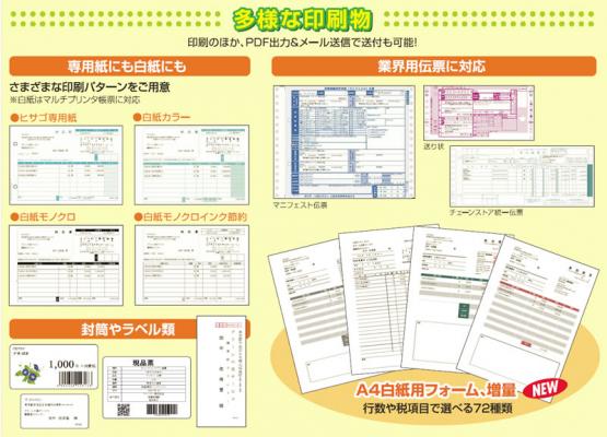 初心者にわかりやすいPCソフトとして、見積書・納品書・請求書などポピュラーな伝票から、業界用の統一伝票まで幅広くフォームを収録する「伝票印刷」。このたび、様式変更に伴いマニフェスト伝票とヤマト運輸送り状の新フォームを追加。さらに、使い勝手の良いA4白紙用テンプレートを約60種増量して新発売いたします。伝票の発行方法は、フォームへの直接入力のほか、Excel等外部データの読込や付属Excelブックで販売管理をしながら、など。文字や画面を拡大できる機能が強化され、さらにわかりやすく使いやすくなりました。伝票のレイアウトや表現にこだわった「印刷」、そのほか、PDF出力やメール送信機能も搭載しています。なお、2019年予定の新元号には無償対応し、消費税率の変更や設定は柔軟に対応可能です。