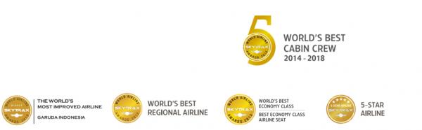 ガルーダ・インドネシア航空はスカイトラックス社 エアライン・スター・ランキングの最高評価である「5スター」を2015年から継続して獲得。その他の受賞歴は以下の通り。