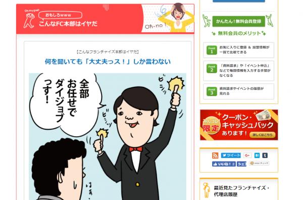 今回リリースした「起業・独立・開業なび」では「フランチャイズや代理店に加盟するメリット・デメリット」「加盟して開業するまでの流れ」など、フランチャイズや代理店に関する基礎知識はもちろん、少し息抜きにもなる面白コンテンツ「こんなフランチャイズ本部はイヤだ。」を用意しております。「こんなフランチャイズ本部があったらイヤだなー」 そんな妄想を面白おかしくイラストにしました。 起業や開業は大変ですのでストレスも溜まります。 こういうおふざけであっても少しでも笑えれば、リラックスしてフランチャイズや代理店探しができるのではないかと思っています。