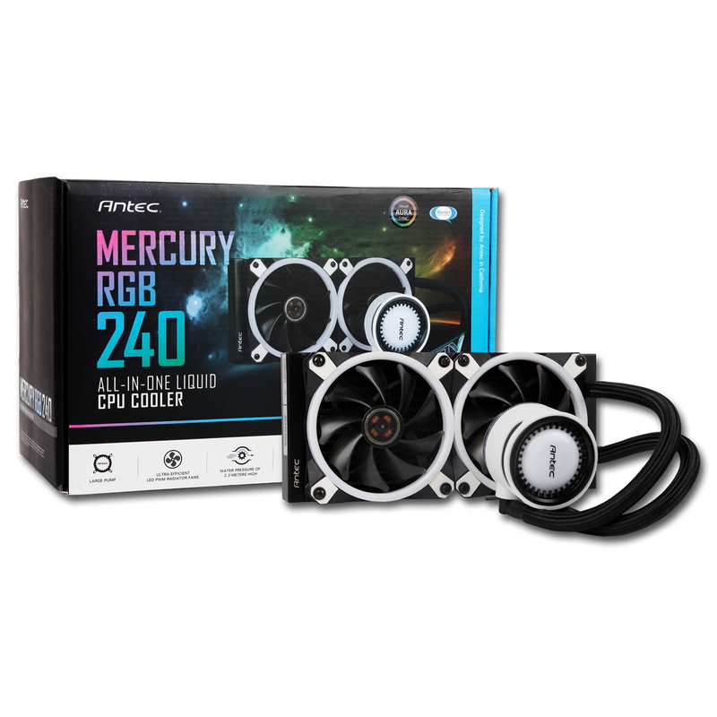 Mercury RGBは、ASUS AURA SYNC対応の水冷一体型ユニットのCPUクーラーです。マザーボードのRGB SYNCに対応する+12V RGB Header (4pin)および、専用RGBコントローラーと、最大1800RPM PWMに対応した120mm RGB LEDファンを搭載、流量3.5L/minを誇る大容量ポンプによりCPUの熱を素早く輸送して冷却します。高耐久グラファイトベアリングとセラミックシャフト、信頼性を高めた高品質PTFEチューブによりメンテナンスフリーで、長期5年の製品保証を実現、ラジエータサイズ120mm、240mm、360mmの3モデルをラインアップ。