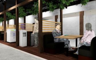 最近の傾向として、会議室の需要が高まっていることから、8名収容の完全個室タイプの会議室を1室ご用意。簡易な打合せ用スペースを5か所設置し、当社の拠点の中でも特に、共用部を充実させたレイアウトにしました。ビジネスパートナーを招いての打合せや会議、社内での研修や面談などに幅広くご利用いただけます。飲食が出来るカフェブースも設け、フリードリンクもご用意しました。