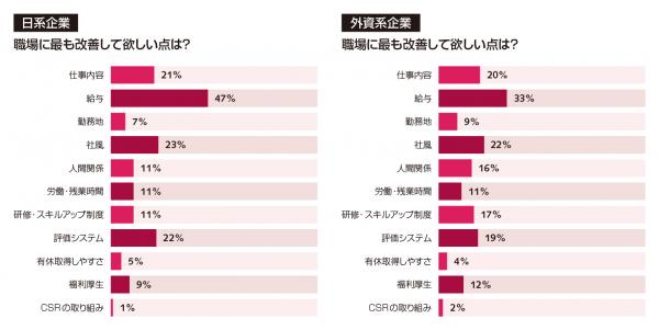 今回のアンケート調査で聞いた「現在の職場で改善してほしい点」は、1位「給与」(40%)、2位「社風」(23%)、3位「評価システム」(20%)でした。日系企業の勤務者に絞って結果を見ると「給与」への不満を持つ回答者は47%と、外資系勤務者の33%を14ポイント上回ります。