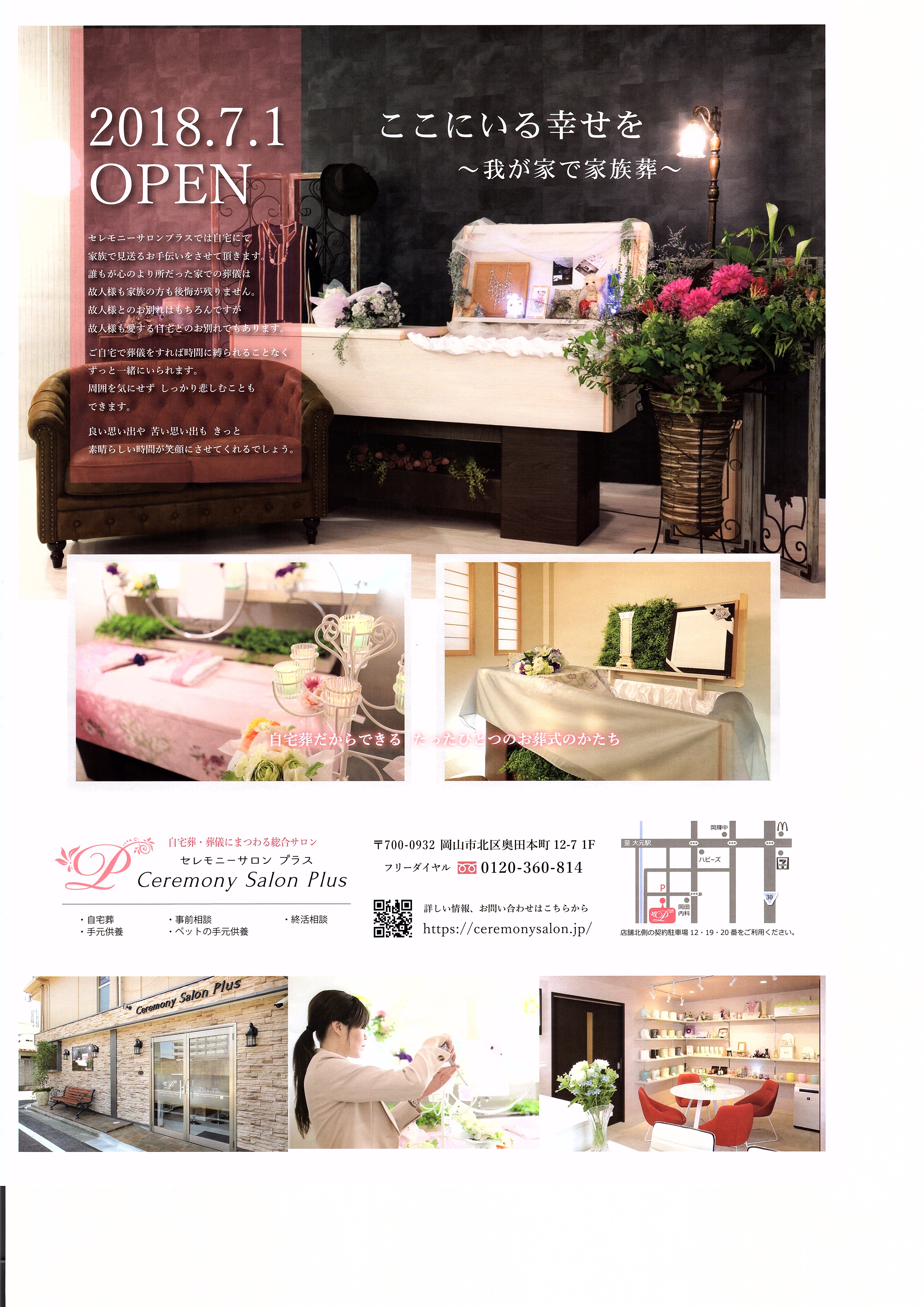 株式会社PLUS(代表取締役:藤原 正博、所在地:岡山市南区)は、2018年7月1日(日)10時、岡山市北区奥田本町にセレモニーサロンプラス(https://ceremonysalon.jp/)をオープンします。セレモニーサロンプラスでは、故人様をご自宅でお見送りをする「自宅での家族葬」を専門とした葬儀社です。地域に密着した街の“セレモニーサロン”としてご自宅での葬儀から終活、ペットとのお別れのご相談等、幅広く承っております。