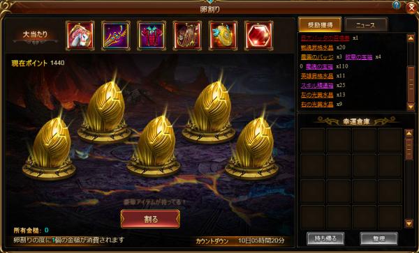 獲得した金槌を使って卵割りに参加することが出来ます。卵割りには新衣装【農園の休日】や限定騎獣【回転木馬】などが登場致します。また、卵割りを行うたびにポイントがたまり、集めたポイントから黄金や宝石箱など、レアアイテムを獲得することが出来ます。