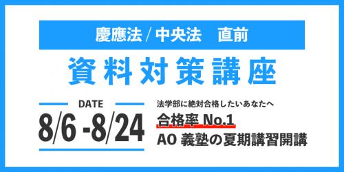 AO義塾では、慶應法学部、中央法学部に絶対合格したい受験生に向けて、夏期講習第2弾として8/6~8/24にかけて法学部直前期資料対策講座を開講します。この期間は提出書類のブラッシュアップができる最後の期間になります。まだ書類が完全な形になっていない方、また、他の大学が第一志望で、法学部の出願書類がまだ進んでいない方、このチャンスを最大限活かして、共に合格を勝ち取りましょう!