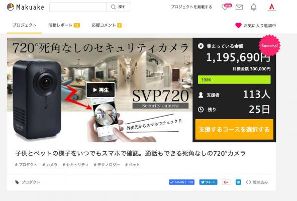 ADZUKI TRADING(アズキトレーディング)(本社:東京都中央区)では、水平・垂直360度で死角のない映像をスマートフォンなどで確認、通話もできる720度カメラ「SVP720」の先行販売をクラウドファンディングサイト「Makuake(マクアケ)」において、7月13日(金)から8月20日(月)まで実施しています。外出時などに子どもやペットの様子をスマートフォンで確認することができて、通話もできるコンパクトで高品質の720度カメラ。Makuakeでの販売は8月20日までです。(現在110名を超えるサポーターを集めて、目標販売金額の約4倍の販売を達成 7/26 12:30現在)