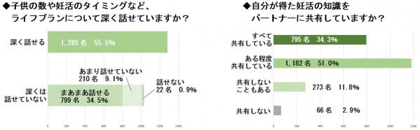 「子供の数や妊活のタイミングなど、ライフプランについて深く話せていますか?」の質問に対し、「深く話せる」以外(まあまあ話せる・あまり話せていない・話せない)を選んだ方は44.5%と、4割以上の方が深く話せてはいないことがわかりました。また、「自身が得た妊活の知識をパートナーに共有していますか?」の問いに対し、「すべて共有している」が34.3%でした。