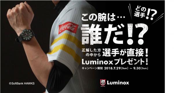 この度、タフで本格ミリタリーウォッチとして人気の高いLuminoxと福岡ソフトバンクホークスとのコラボキャンペーンとして「この腕は・・誰だ!?」キャンペーンを開催いたします。正解した方の中から3名様には、なんと福岡ソフトバンクホークスの選手が直接Luminoxウォッチをプレゼントいたします。
