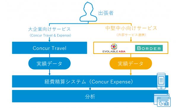 【中堅中小企業向け コンカー、エボラブルアジア、ボーダー 出張手配・経費精算サービス連携図】