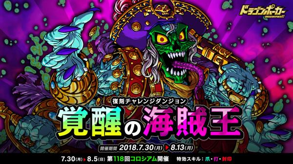 株式会社アソビズム(本社:東京都千代田区、代表取締役:大手智之)は、App Store・Google Playにて好評配信中のリアルタイム合体カードバトル『ドラゴンポーカー』で、2018年7月30日(月)より、復刻チャレンジダンジョン「覚醒の海賊王」を開催いたします。本ダンジョンでは、覚醒した「大海賊ジーべック」がボスモンスターとして登場!ダンジョンをクリアすると、進化用の素材や限定オーブなど様々なレアアイテムが手に入ります。ダンジョンで覚醒進化素材を手に入れ、モンスターを覚醒させましょう!