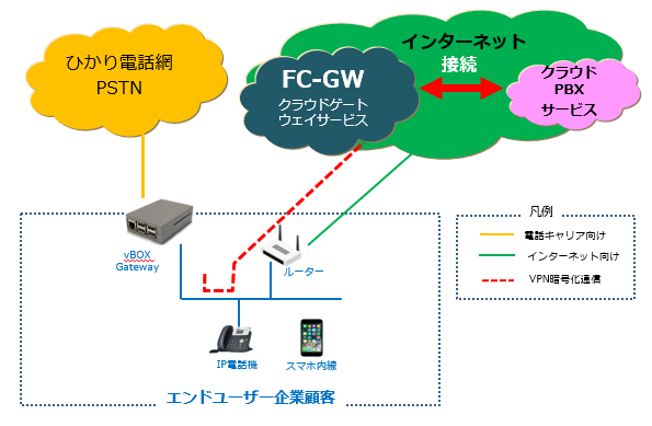 FC-GWにクラウドPBXを接続することで、全国の0ABJ番号(NTT東西、NTTコミュニケーションズ、KDDI、アルテリア)を利用することができます。