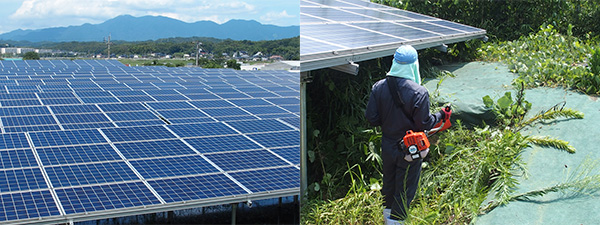 飯塚市の発電所については、雑草であるセイタカアワダチソウやツタ、イネ科の植物などが多く生い茂り、今後の発電や点検作業に支障が出ることから草刈り機を導入し一斉に駆除、除草剤の散布も行いました。
