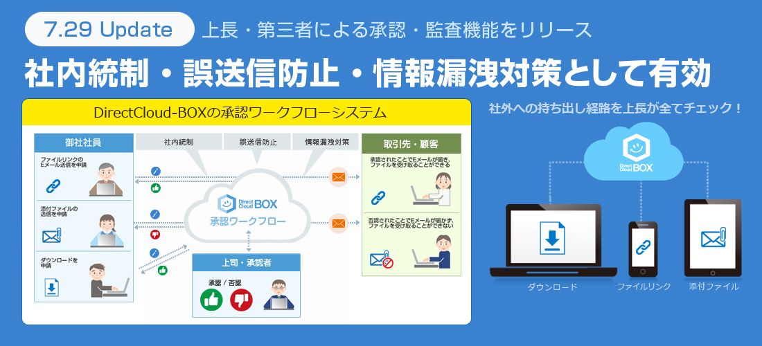 DirectCloud-BOXの承認ワークフローは、ファイルの送信やダウンロードによるファイルの持ち出し時に、承認者のメール監査により許可を得たファイルのみ送信を可能とする機能です。社外への持ち出し経路を上長・第三者による承認・監査が可能となり社内統制の徹底、誤送信防止や情報漏洩対策に効果を発揮します。