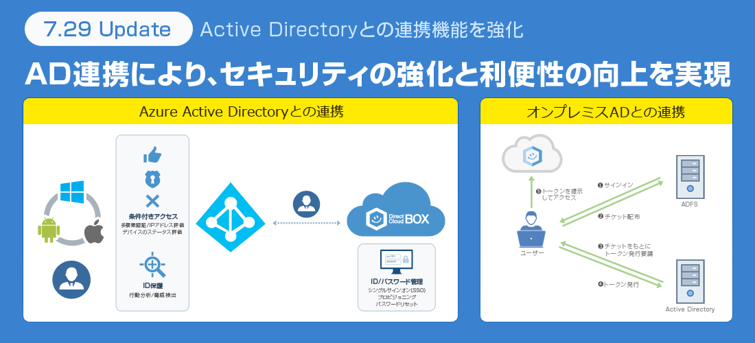 DirectCloud-BOXのAD連携とは、企業が既にお持ちのADのアカウント情報を利用し、DirectCloud-BOXへのログインを可能とする機能です。Azure Active DirectoryまたはActive Directoryをご利用の場合、 DirectCloud-BOXとの連携により、セキュリティ強化および利便性向上を実現することができます。
