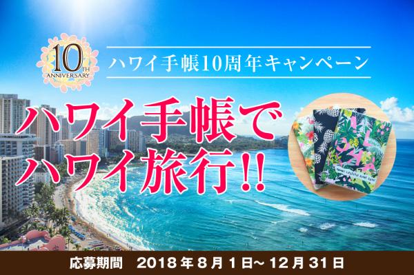 これまで多くの皆さまにご愛用いただいてきた感謝の気持ちを込めて、本年は10周年記念企画「ハワイ手帳でハワイ旅行」キャンペーンを2018年8月1日~2018年12月31日までの期間で実施いたします。