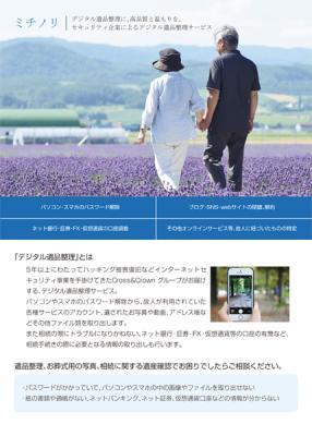 ネットセキュリティ事業を展開するクロスアンドクラウンセキュリティインテリジェンス合同会社(所在地:東京都港区、代表社員:増子 貴仁)は、パソコン・スマホのパスワード解除や、画像・動画など各種ファイル、その他ネットサービスアカウントなどの内部データ抽出を行うデジタル遺品整理サービス「ミチノリ」の代理店募集を2018年7月31日より受付開始します。