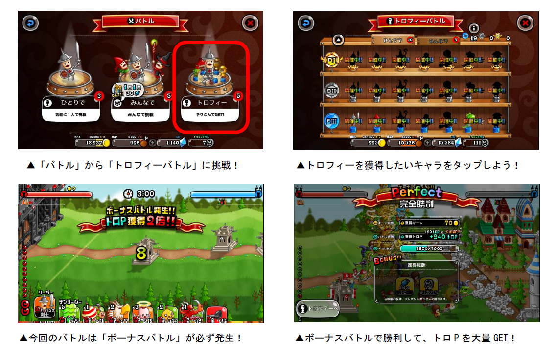 各キャラのトロフィーは、「トロP」を一定数貯めると獲得することができます。トロPを獲得するには、「キャラのLvが20以上」「うまP200以上」など各キャラによって条件が異なります。条件を満たした状態でバトルを行なうことでトロPを獲得できます。また今回は「ボーナスフィーバー」が同時開催され、全てのトロフィーバトルが、獲得トロPが2倍以上となります。「ボーナスバトル」はバトルの勝敗に関係なく、獲得トロPが2・3・5・10倍のうちいずれかの倍率で増加します。「ボーナスバトル」で勝利してトロPの大量獲得を目指しましょう!