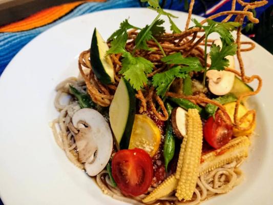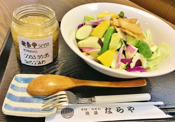 お蕎麦の上には10種類以上の新鮮野菜がたっぷりと添えられパリパリの揚げ蕎麦とともに自家製ドレッシングをかけていただくメニューです。具やドレッシングのカスタマイズが可能。