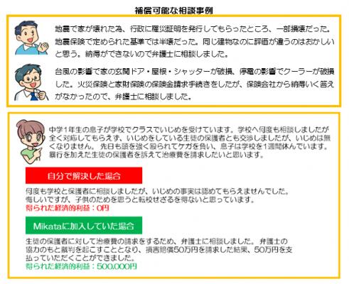 「保険会社から満足いく補償が受けられない」「行政から罹災証明がでない」「住宅ローンの支払いどうしよう」などのトラブルに遭遇した際でも、弁護士保険『Mikata』に加入していれば、「弁護士直通ダイヤル」で直接弁護士に初期相談(※1)、更に「弁護士紹介サービス」(※2)で紹介する弁護士が交渉窓口となって事後のサポートをします。