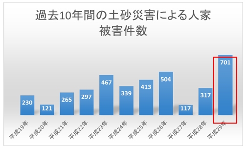 国土交通省が発表した2017年の土砂災害による人家被害は全国で701件。過去10年間で最大件数を記録しました。そして、内閣府発表の「平成30年7月豪雨」被害状況によると、全壊した住家だけで3,598件を記録。