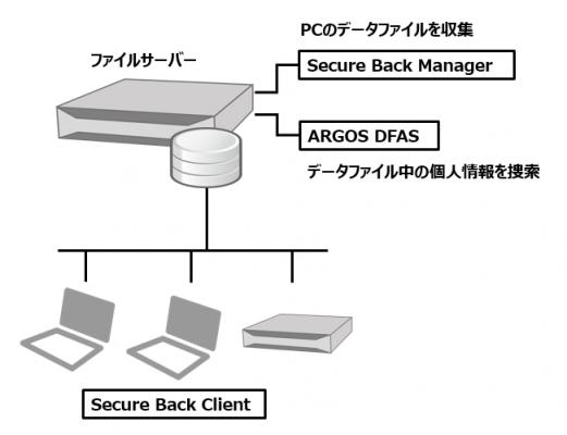 機密情報検知・保管セットで利用されるSecure Back 4は、Windowsファイルサーバーと、それに接続されるPCにソフトウェアをインストールすることで、PCに置かれたオフィスファイル等が自動的にリアルタイムにファイルサーバーにバックアップされるものです。PCの利用者は従来の操作方法と全く違いなく作業をしながら、PCの故障などに備えたバックアップが自動的にファイルサーバーに作成されるものです。同じく機密情報検知・保管セットで利用されるARGOS DFASは、Windowsファイルサーバーにおかれたバックアップファイルを参照し、そのファイル含まれるクレジットカード番号、マイナンバー、電話番号といった各種の個人情報の有無を確認し、必要に応じてファイルの削除を行うことができるものです。