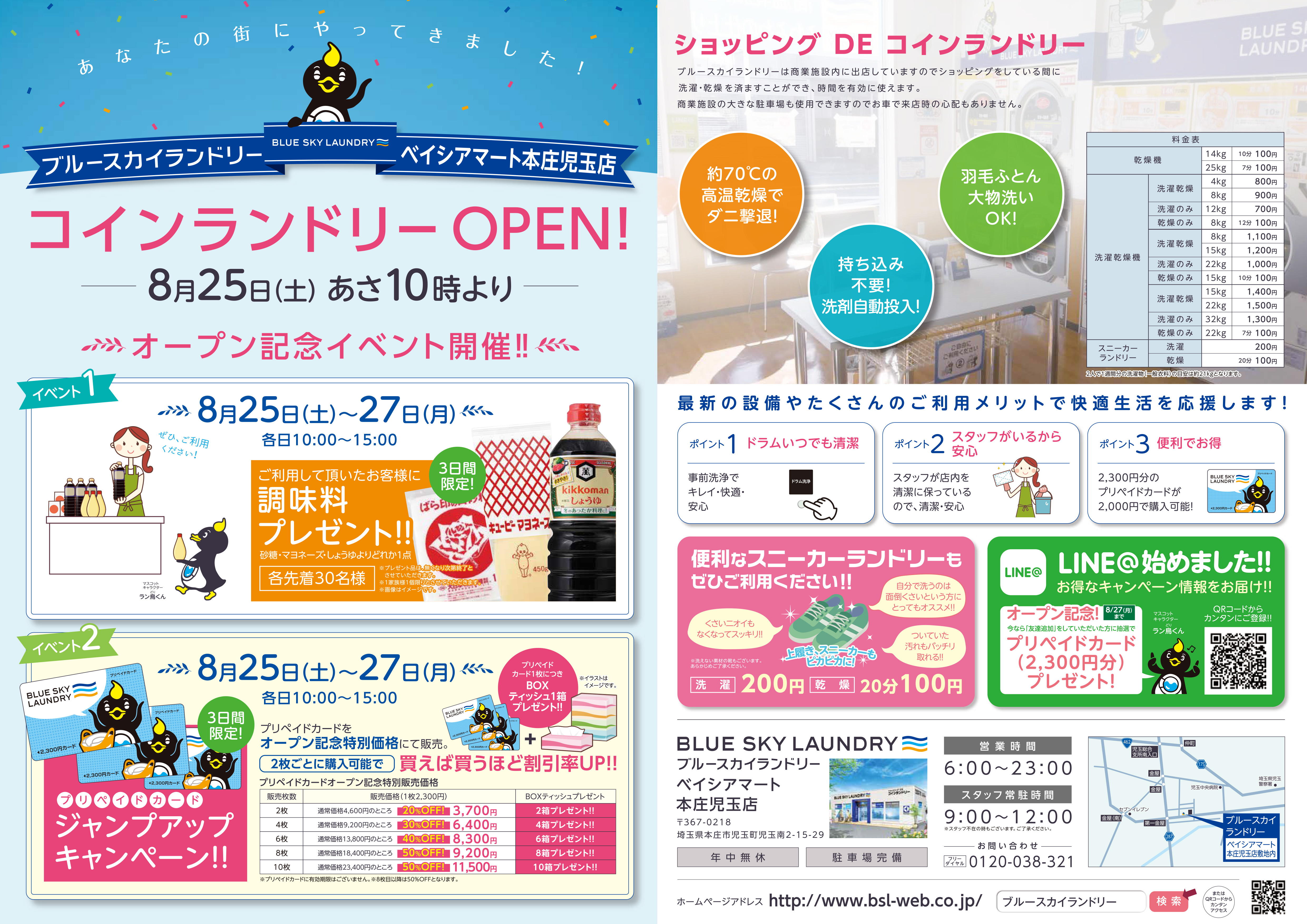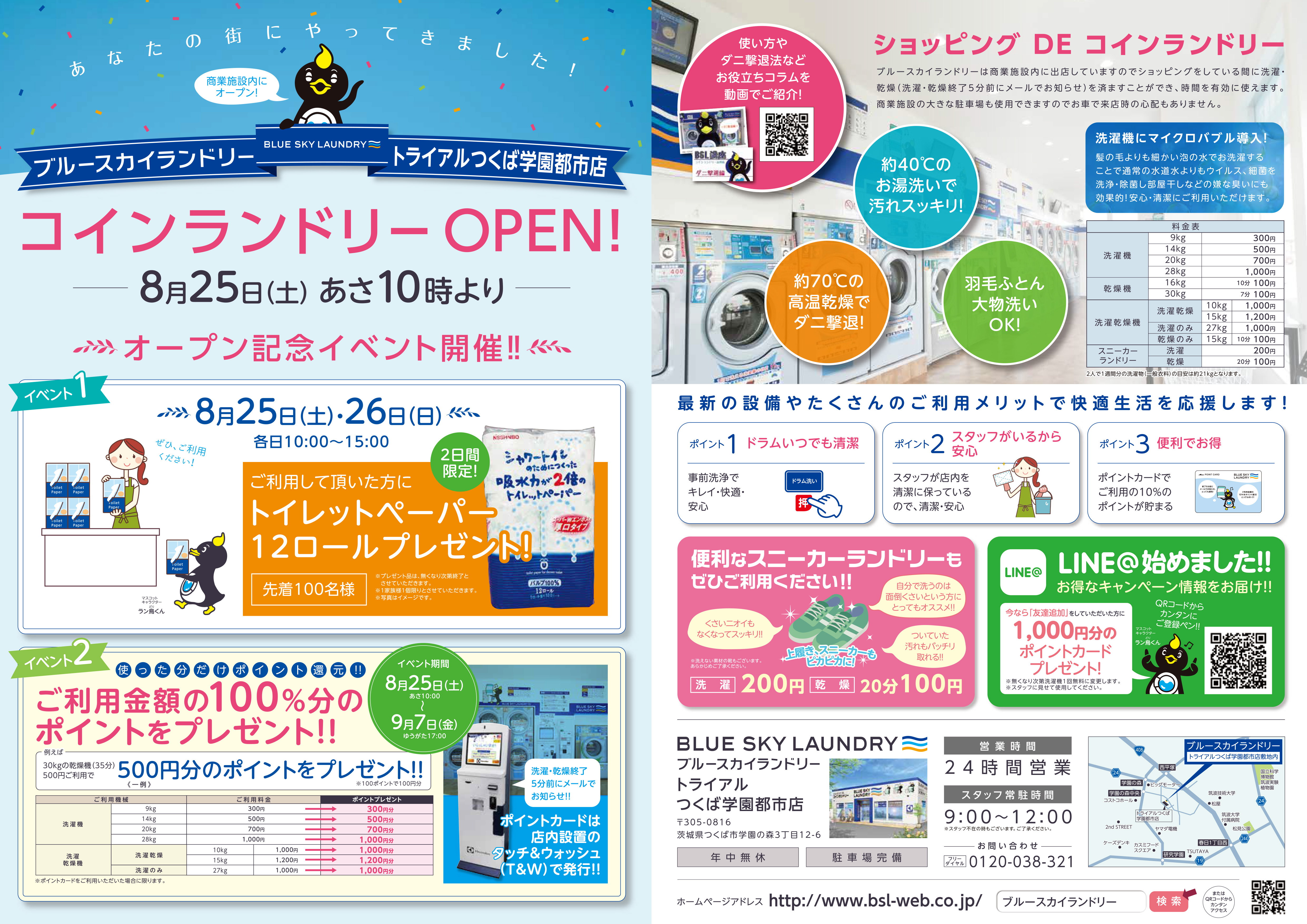 私たちブルースカイランドリーは、「ショッピングDEコインランドリー」をコンセプトに大手商業施設敷地内にコインランドリーを集中出店しております。この度2018年8月25日(土)より2店舗同時オープンします。関東地区10店舗目の出店となります。茨城県のトライアルつくば学園都市店駐車場敷地内にブルースカイランドリートライアルつくば学園都市店、埼玉県のベイシアマート本庄児玉店駐車場敷地内にブルースカイランドリーベイシアマート本庄児玉店を出店致します。