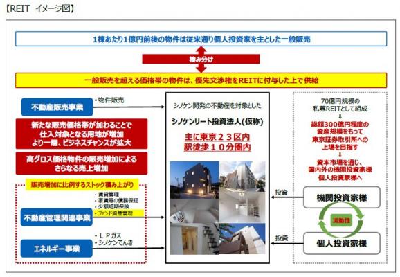 今般、組成を目指すこととしたREITは、これまで個人投資家様へ提供させて頂いているサービスを同様にREITへも提供し、シノケンの全面的なバックアップによる高収益の確保・資産規模の継続的な成長を企図しております。シノケンの既存事業において、(1)不動産販売事業ではシノケンハーモニーからREITへの物件売却による継続的な売上増加を実現し、(2)不動産管理関連事業およびエネルギー事業ではシノケンファシリティーズ等からREIT所有物件に対する賃貸管理サービスや保険、エスケーエナジーからのLPガスと電力の小売販売等の件数・戸数の積み上げを加速させ、加えて(3)株式会社シノケンアセットマネジメントのREITに対する資産管理サービス提供という新たな収益の積み上げ等、REITとシノケンのグループ会社各社との間での相当なシナジーの発現が期待されます。