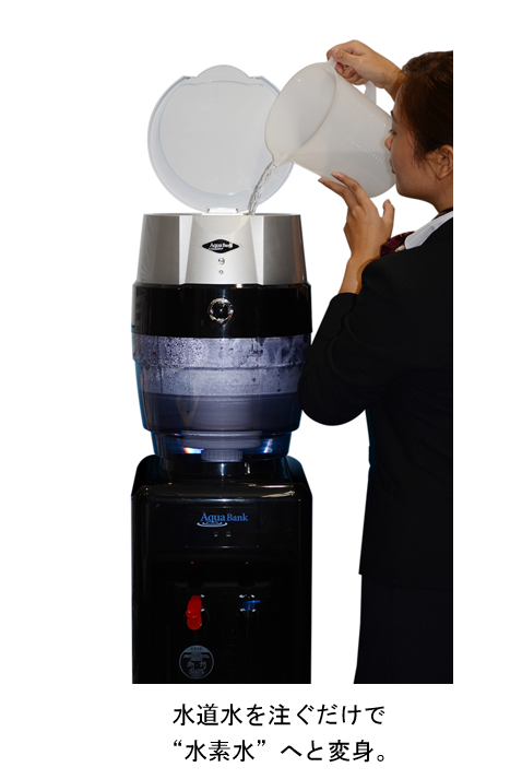新発想のウォーターサーバー「Aqua Bank(アクアバンク)」とは、水道水から“ミネラル水素水”を作ることができるウォーターサーバーです。