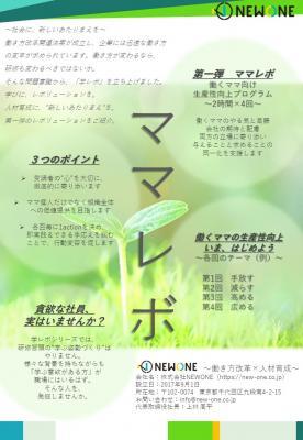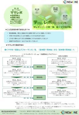 これからの働き方に関して企業へ人材育成・組織開発サービスを展開する株式会社NEWONE(本社:東京都千代田区 代表取締役:上林周平)(https://new-one.co.jp/)は、「学びにレボリューション」をコンセプトに、時短勤務等で“働くママ”向けに、研修時間を従来の1/4に圧縮した研修プログラム『ママレボ』を新たに、2018年8月1日より販売開始致しました。