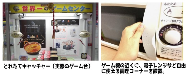 そこで、当社では、電子レンジや紙皿、プラスチック製スプーンなどを用意し、店内に自由に使って頂ける調理コーナーを設置しました。これにより、取った景品を自ら温め、休憩コーナーで食事をすることが出来るようになりました。これがとれたてキャッチャー誕生のきっかけです。