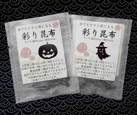 【彩り昆布〈ハロウィンかぼちゃ〉〈ハロウィンおばけ〉】は乾いた小さな昆布を5分ほど水でもどすと、ハロウィンかぼちゃとハロウィンおばけの形に早変わり!ハロウィンのお料理を可愛く楽しく演出いたします。