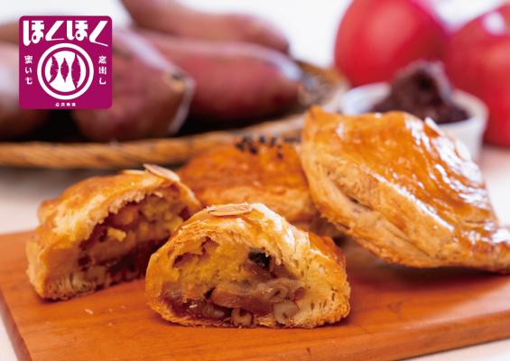 パイの中には、蜜いものスイートポテトの美味しさを引き立てる、こだわりのフィリングが。爽やかな甘さのりんごとくるみ、和の味わいの十勝生まれのつぶあん、そしてシーズンで変わるフレーバー。他にはない「窯出し蜜いも ほくほく」ならではの美味しさです。