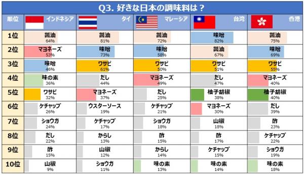 インドネシア以外の4カ国は、好きな調味料も醤油、味噌、ワサビが上位を占めました。