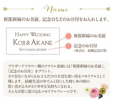 アクリルの表面には「新郎新婦のお名前」「記念のお日付」をプリントいたします。
