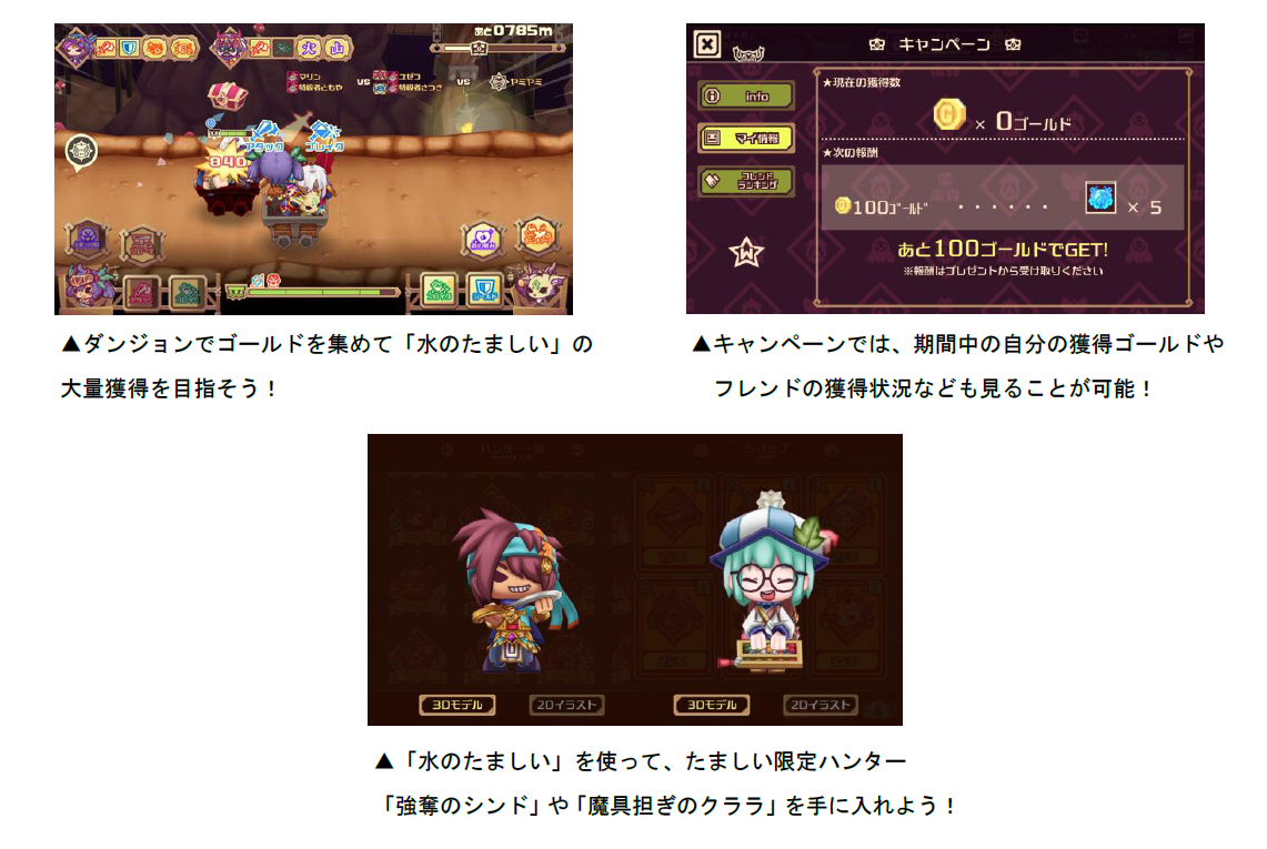 8月21日(火)より、“ダンジョン”でのゴールド獲得数に応じて「水のたましい」がもらえる、「水のたましいキャンペーン」を開催いたします。キャンペーン期間中、“ダンジョン”で5000ゴールドを獲得すると「水のたましい」が最大で210個もらえます。