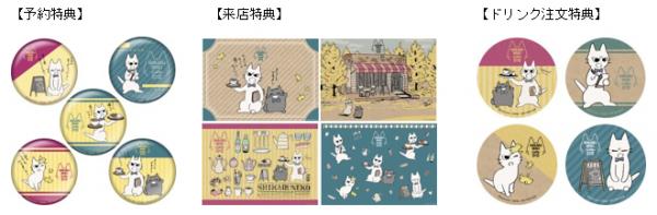 当カフェは事前予約制です。事前予約をされた方には「オリジナル特大缶バッジ(全5種のうちランダムで1個)」をもれなくプレゼント、そのほか来店特典に「オリジナルランチョンマット(全4種のうちランダムで1枚)」、またドリンクをご注文のお客様に「オリジナルコースター(全4種のうちランダムで1枚)」のプレゼントをご用意してお待ちしております!