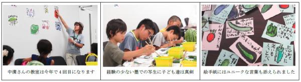 絵手紙教室では製作前に講師の中溝裕子さんから、自分が食事をするまでに様々な人が関わっている事、元気でいる為に食事が大切な事などのお話があり、子どもは真剣な様子で耳を傾けました。その後、地域住民の方々から頂いた野菜を題材に、両親や祖父母に宛てて日々の感謝の気持ちなど一言添えた絵手紙を心込めて作りました。