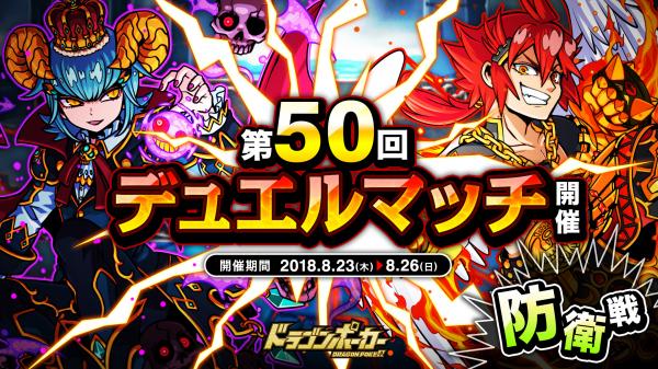 株式会社アソビズム(本社:東京都千代田区、代表取締役:大手智之)は、App Store・Google Playにて好評配信中のリアルタイム合体カードバトル『ドラゴンポーカー』で、2018年8月23日(木)より「第50回デュエルマッチ本戦」を開催いたします。今回のルールは「防衛戦」です。デュエルマッチでは、バトルで獲得できる「デュエルP」に応じてランキングが決まり、リーグ終了時に報酬が獲得できます。また、累計勝利数に応じて、限定カードも手に入ります。相手の心理を読み、1vs1の真剣勝負に挑みましょう!