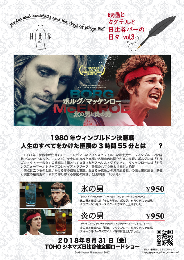 株式会社日比谷Bar(本社:東京都文京区 代表取締役:大城 政次)は、東京都内で展開する日比谷Barにて、8/31(金)より公開される映画『ボルグ/マッケンロー 氷の男と炎の男』とタイアップしたカクテルプロモーションを8/25(土)~9/30(日)の期間限定で実施いたします。