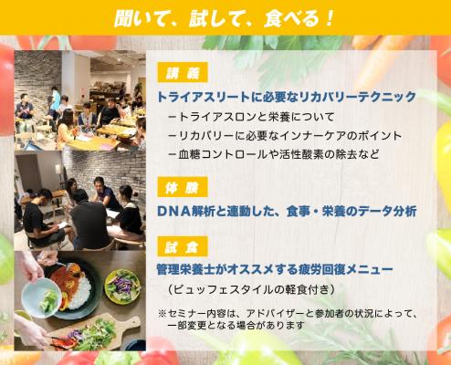 この栄養セミナーは、各回ごとにテーマを分けたシリーズ開催を予定しており、トライアスロンにちなんで、講義×体験×試食の3つのパートに分けた内容を提供します。