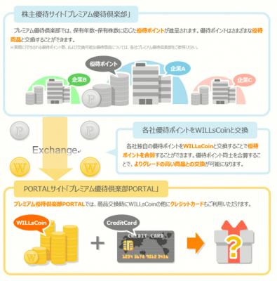 1. サービスの概要 「プレミアム優待倶楽部 PORTAL」では、上場企業各社の株主優待サイト(プレミアム優待倶楽部)で保有している優待ポイントを共通株主優待コイン「WILLsCoin」に交換することで、2,000 点以上の優待商品と交換することができます。