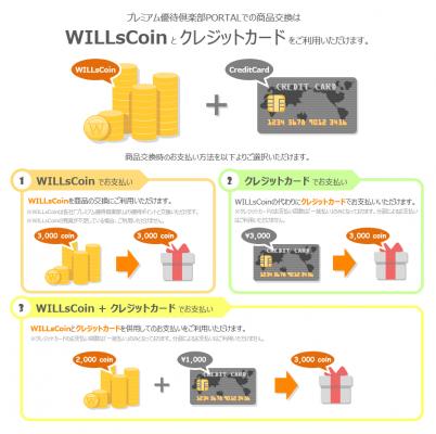 この度導入いたしましたクレジットカード決済システムにより、「 WILLsCoin」での商品交換時の不足差額分をクレジットカード決済によって補填することや、商品をカード決済によってご交換いただくことが可能になります。